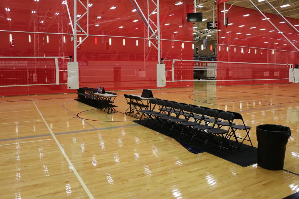 Downstairs we have pull-out bleachers built into the walls for easy access. These bleachers are used more for non-traditional sports that do not use the volleyball or basketball standards and special events. Each bleacher will seat up to 72 spectators giving us a grand total of 576 total seats available downstairs. Additionally, each team gets premium black chairs that are rowed out onto a black carpet. This allows each player to have their own backed chair with prime views of the court.