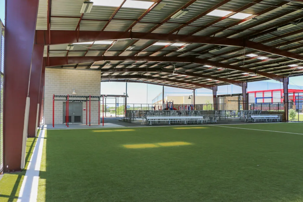 Outside we have a spacious outdoor pavilion with multi-sport turf, playground, concession area, and restrooms. This open-air facility is equipped with sports equipment for athletes to utilize in practice. The pavilion is also the perfect space for birthday parties and special events! Outside we also have a playscape with an outdoor grassy tailgating area with seating. This area is the ideal spot to relax in between games and gather with teammates.